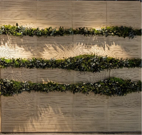 Musgos y plantas preservadas, cuidadosamente seleccionadas, brotan con fuerza entre paneles modelados con curvas y relieves, inspirados en la técnica artesanal vareta para trabajar la madera, muy utilizada por artistas falleros en Valencia, pero desde una nueva perspectiva contemporánea.