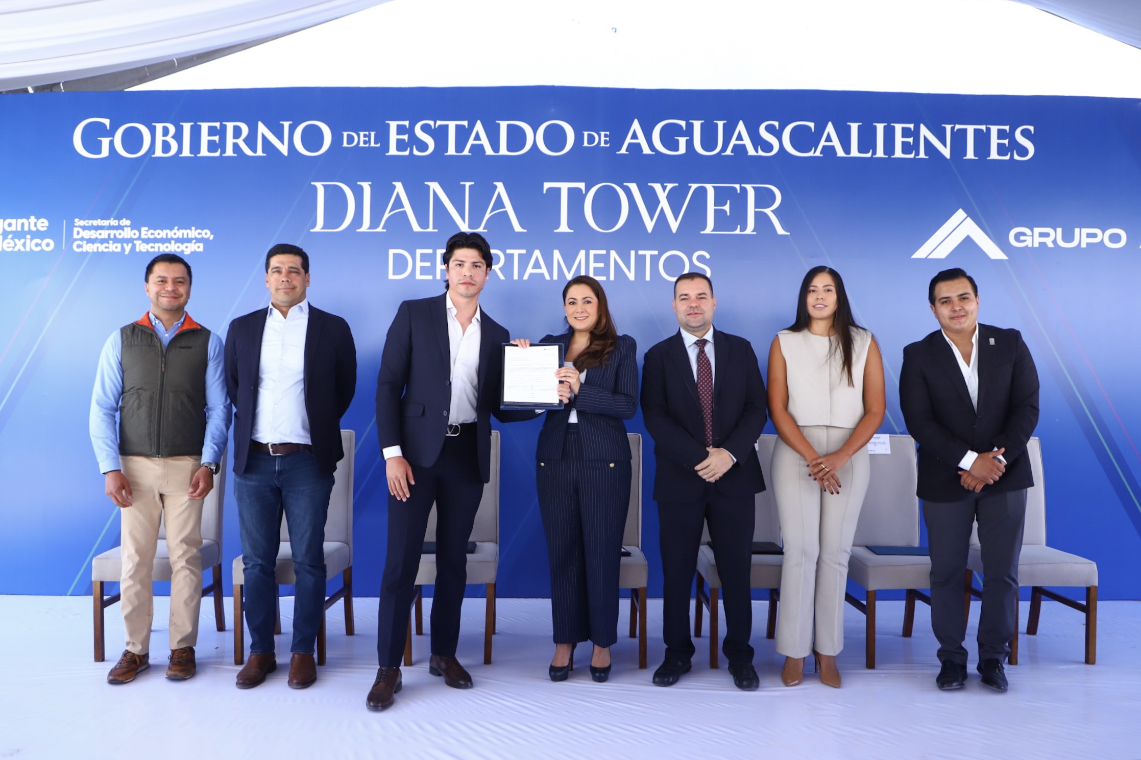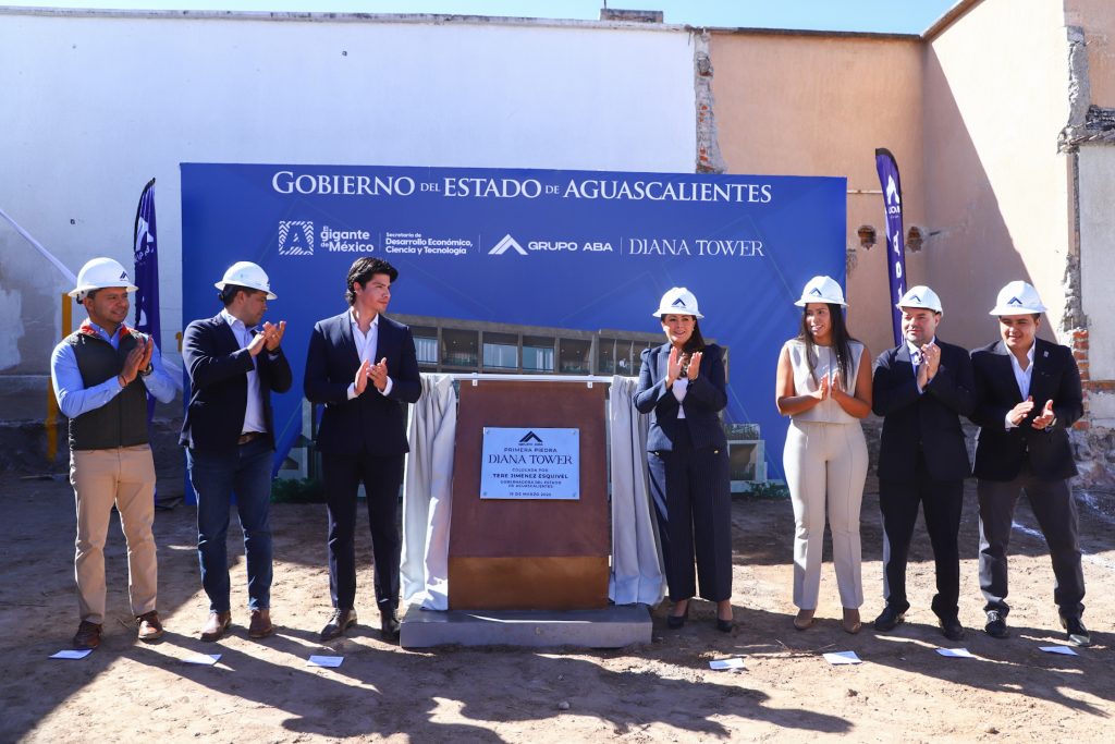 La gobernadora de Aguascalientes, Tere Jiménez, encabezó la colocación de la primera piedra del proyecto inmobiliario Diana Tower del Grupo ABA, inversión de 100 millones de pesos que generará 80 empleos directos.